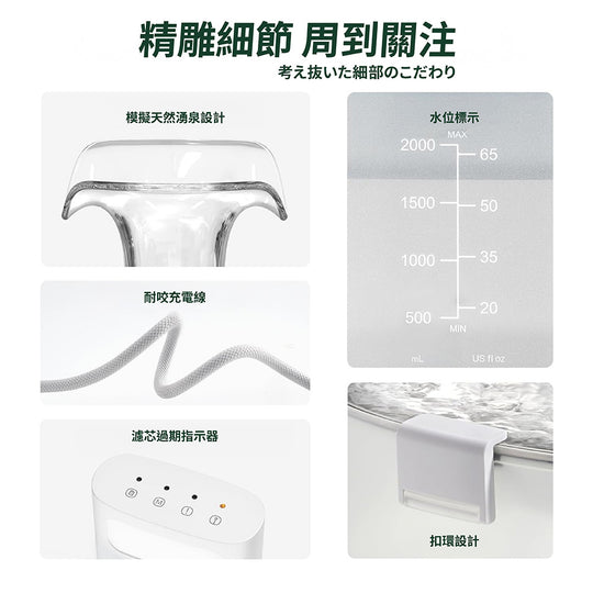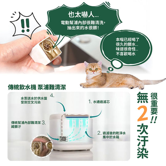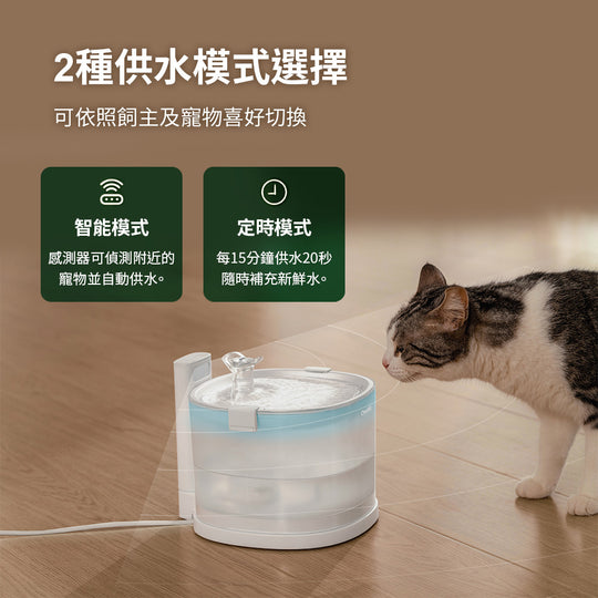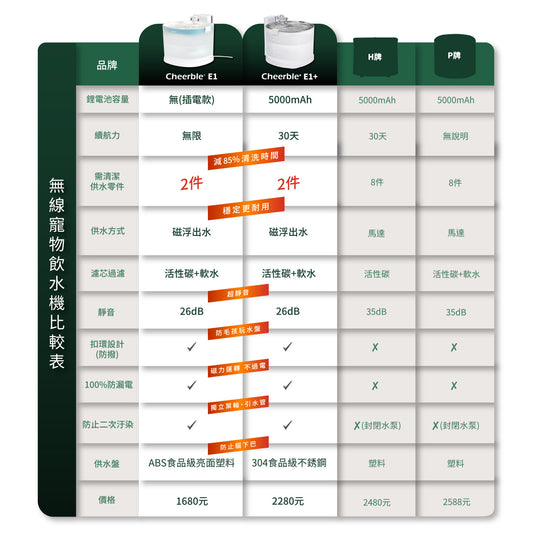 商品特色 👍專利Mag Drive™ 無泵浦磁力供水,全球首創👍美國、日本幕資破萬台👍供水僅2個元件,減少85%清潔時間👍26dB超靜音,保持寧靜👍防撥卡扣、防止寵物撥水盤及撥水👍26dB超靜音,保持寧靜👍2L水箱容量,無需每天蓄水換水👍歐盟CE、美國FCC多項國際認證,食品級塑料,飲用好安心 無泵寵物飲水機E1 Q&AQ:什麼是「無泵浦」? A:「無泵浦」是指水箱內沒有電子元件。水流由磁力驅動。Q:飲水機適合什麼樣的寵物? A:小型犬及貓咪。Q:濾芯應該多久更換一次?有什麼提醒嗎? A:建議每 21 天更換一次濾芯。濾芯過期指示器會亮燈,讓您知道何時需要更換。Q:水位低時是否有警告? A:當水位低於「MIN」水位線時,智慧底座上的指示燈會變成橘色,提醒使用者加水。水族箱呈半透明狀,並帶有刻度,讓主人不僅可以直接查看水位,還可以觀察並記錄寵物的飲水量。Q:智慧型感測器的感應範圍是多少? A:採用 PIR(被動紅外線)感測器技術,當寵物位於飲水機前方 120° 範圍內時,此技術可感知寵物的存在。Q:葉輪會不會被毛髮卡住? A:我們在設計過程中就考慮到了這個問題。我在沒有過濾器的情況下進行了多次貓毛測試,葉輪從未堵塞。而且,濾筒可以有效去除大部分大顆粒雜物,進一步減少頭髮被葉輪卡住的可能性。 商品規格品牌:Cheerble®品名:無泵寵物飲水機 E1型號:CDY01額定電壓:5V⎓1A材質:ABS+SAN水箱容量:2L外箱尺寸:23.5cm x 25.5cm x 20.5cm產品尺寸:22.2cm x 20.4cm x 19cm產地:中國保固:非人為因素之損壞,原廠保固一年內容物:主機x1、適配器x1、電源線x1、濾芯x1、使用說明書x1※ 鑑賞期並非試用期,寵物家電考量衛生問題無提供試用,產品一經拆封使用無法整新賣給下一位消費者,恕無法接受退貨,訂貨前請先確認評估。原價 $1,580.00原價 $1,580.00