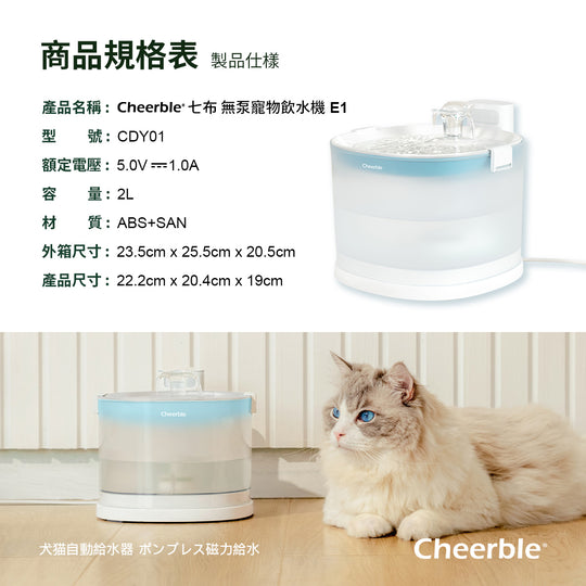 日本Cheerble七布 無泵寵物飲水機 E1 (插電款) 磁力供水