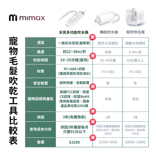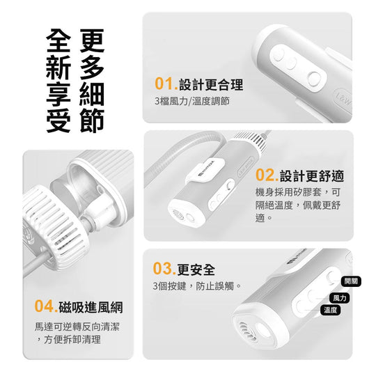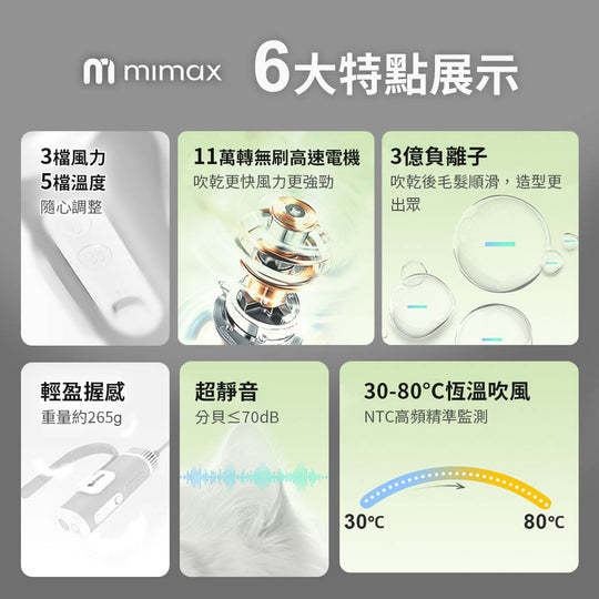 商品特色👍手持、掛脖、360度支架,三種用法👍3檔風力 5檔溫度調節👍11萬轉無刷高速電機風力更強勁 吹乾只要10~25分鐘👍3億負離子 吹乾後毛髮順滑 造型更出眾👍輕盈握感 重量約265g👍超靜音 分貝≤70dB👍30-80°C恆溫吹風 NTC高頻精準監測,過熱保護自動斷電👍搭配支架隨意旋轉彎曲 👍寵物美容院愛用款,可搭配寵物美容台 解放雙手更方便👍1鍵反向清潔,輕鬆免水洗👍保固3年 產品規格品名:多功能寵物吹水機型號:MX-01額定電壓:110V額定頻率:60Hz電源線:2M材質:PC、ABS、矽膠功率:950W產品尺寸:16x6x4cm外箱尺寸:19.1×8.5×23cm淨重:265g內容物:主機×1、掛脖支架×1、360度方向支架×1保固 : 非人為損壞保固3年※ 鑑賞期並非試用期,因衛生疑慮無提供試用,訂購前請先確認評估商品是否符合需求。鑑賞期內進行商品退換貨時,應負有恢復原狀之義務。如退貨部門收到檢查,外盒破損、有使用過痕跡、商品受損汙損、商品缺件不完整、包裝袋已毀損破洞無法復原、外箱透明封膜已拆等等,依商品價值損失評估【酌收整新費】。原價 $3,280.00原價 $3,280.00 -