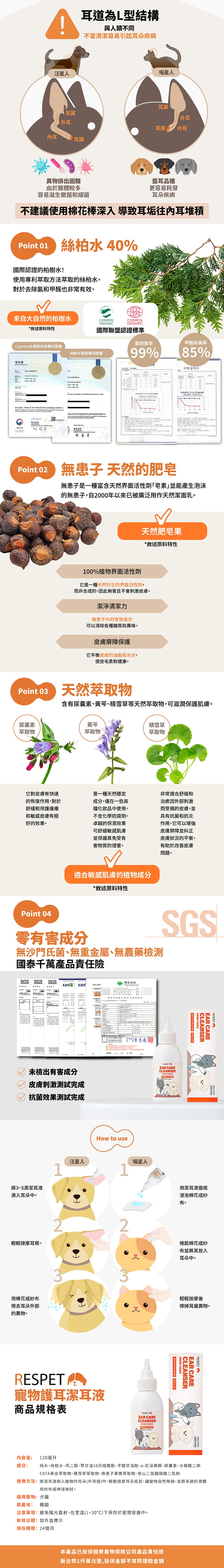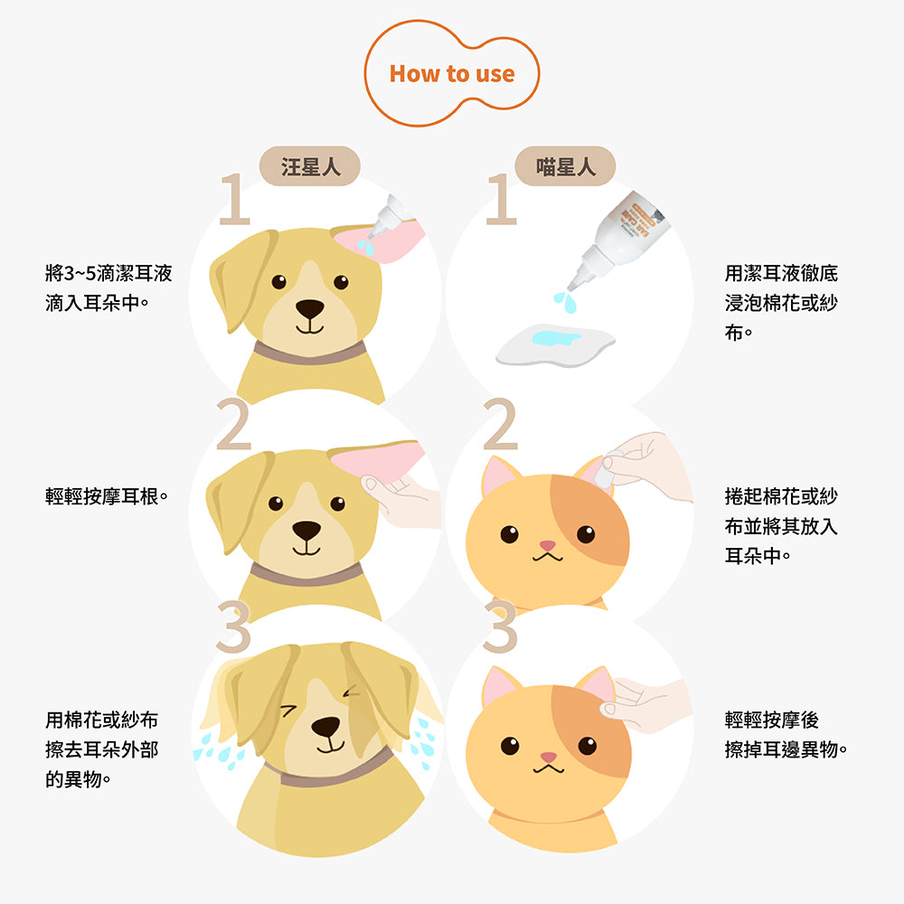 使用方法:將潔耳液倒入寵物的耳朵(外耳道)中,輕輕按摩耳朵底部,讓寵物自然甩頭,並將多餘的液體用紗布或棉球擦拭。