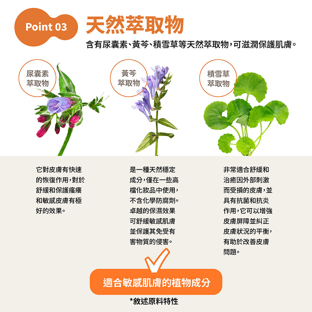 👍天然萃取物滋潤肌膚 含尿囊素、黃芩、積雪草