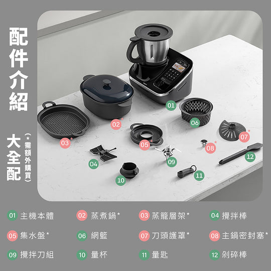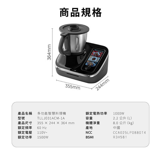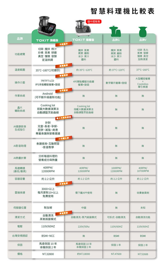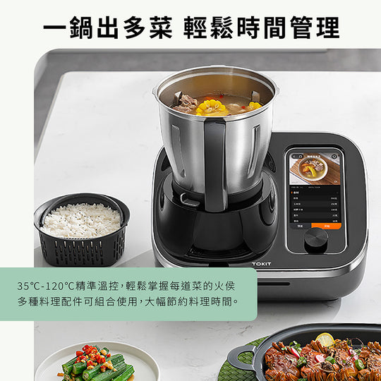 【2025料理機推薦】自帶平板電腦、可以無限線上更新菜譜的料理機開箱!| 開箱找秉鈞.TOKIT廚機多功能AI聯網料理機 |【烹飪挑戰】日本 VS 馬來西亞 | 誰做的咖哩最好吃?【烹飪挑戰】30分鐘烹飪對決製作素食如此簡單開箱秀咖哩沙嗲麵新加坡美食~辣椒蟹秤重和揉麵多種清潔方式商品特色👍首款AI互動生成食譜,並可直接啟動烹飪👍1機35用旗艦版,取代多種鍋具,不佔廚房空間👍內建Android系統,OTA不斷更新解鎖新功能👍10種以上料理模式 中西餐皆可烹飪👍35~180度(可高溫爆炒)👍一鍵高溫清潔,自動清洗鍋具👍影音食譜互動教學,小白變大廚👍40~12000轉,正反轉變速馬達 研磨/揉麵/切碎/碎冰/快炒/慢燉/清蒸/榨汁👍Cookinglo T™ 專利智能晶片輔助系統👍各國料理,雲端食譜3000+以上,每月更新10+以上👍榮獲各項創新國際大獎,通過歐盟食品級認證👍繁體中文版,台灣公司貨,機體保固2年,電機馬達保固10年 TOKIT Q&AQ:料理機語言版本為何?A:世界各國語言都有,如同手機一樣可以自行切換,台灣版預設為繁體中文。Q:使用料理機,家中要有WIFI嗎?A:是的,WIFI聯網才能更新功能及使用雲端食譜。Q:請問雲端伺服器是在哪裡?會有個資問題嗎?A:台灣版伺服器在新加坡,聯網無須輸入個資,所以不會有個資問題。Q:料理機的AI功能有哪些?台灣何時上線?A:目前國外已上線的AI功能有:營養分析、互動影音助理、熱量計算、食材整和(既有食材生成食譜)、家庭成員營養規劃、個人化營養食譜推薦(肥胖、減重、老人、兒童、病患、孕婦),台灣預計2026/02陸續OTA更新。Q:料理機功能為何越用越新?A:因內建安卓作業系統,就像手機一樣會一直更新軟體,原廠會不斷優化OTA更新各種新功能。Q:台灣在地化食譜多嗎?A:TOKIT的料理實驗室,每天都在研究新菜色,目前已累積有3000+以上的料理,將持續一直OTA更新,因台灣剛上市,在地化的食譜也將會陸續更新。Q:為何淘寶的售價與台灣版本不同?A:中國版TOKIT料理機為陽春版Lite,外型雖然一樣,但硬體規格不同、無內建作業系統、螢幕只有4吋、無法升級功能、雲端食譜需搭配APP才能使用、電壓為220V。台灣版為國際旗艦款,可參考美國、歐洲、日本、香港、馬來西亞,台灣販售價屬於CP值最高。Q:鑑賞期解釋及售後保固為何?A: 根據消保法規範鑑賞期為7天,鑑賞期並非試用期,廚房家電使用後因衛生問題將無法再次銷售,會影響退貨權益,開機聯網烹飪後會自動起算保固時間,馬達電機提供10年保固,整機2年保固。Q:標準版與大全配版有何差異?A:標準版有主機、蝴蝶攪拌棒、網籃、食材刮刀、量杯、量匙。大全配版除標準版配件外,額外增加5件式蒸籠配件組(需選購)有蒸籠、蒸籠層架、集水盤、平底鍋塞、刀頭護罩。商品規格品牌 : TOKIT 廚機品名 : 智慧多功能料理機型號 : TLLJE01ACM-1A產品尺寸 : 355 × 244 × 364 mm額定頻率 : 60 Hz額定電壓 : 110V~額定功率 : 1500W額定電熱功率...原價 起價 $29,900.00原價 起價 $29,900.00